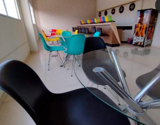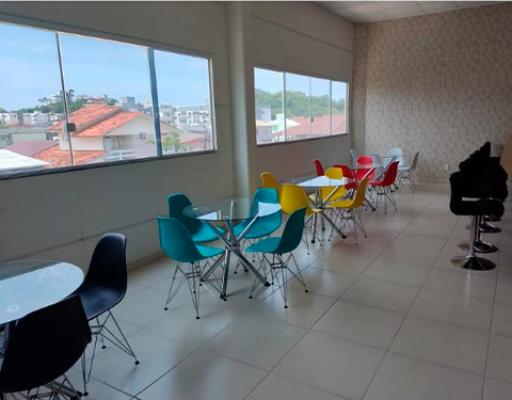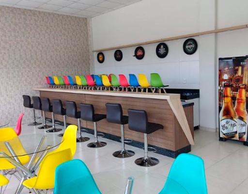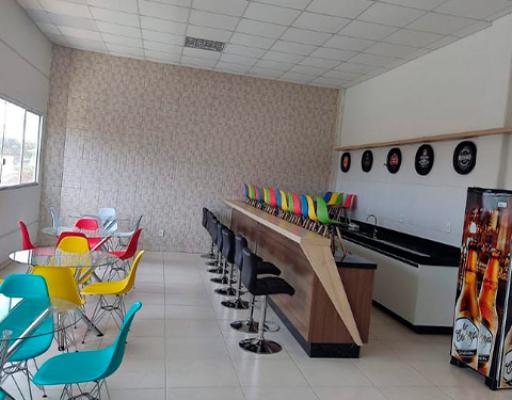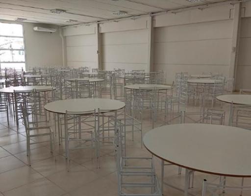 No salão você terá a seu dispor, mesas com tampão e cadeiras de ferro, e ar condicionado para que seu evento ocorra em temperatura mais agradável possível de acordo com a estação do ano.