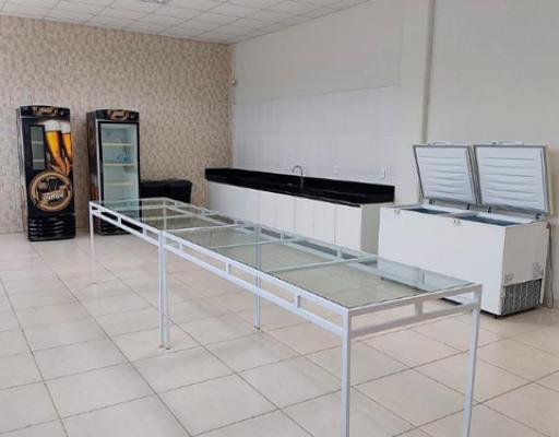 Já no piso térreo, o espaço tem capacidade para 400 pessoas, incluindo uma cozinha ampla, cervejeira e mesa de apoio.